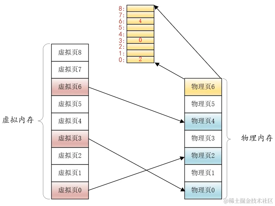 因为现在有9个虚拟页,所以操作系统只需要在物理页中分配一个包含9个元素的数组,虚拟页的页号和数组下标一一对应,数组元素的值表示将元素下标对应的虚拟页映射到哪个物理页的页号。比方说操作系统选择把虚拟页0映射到物理页2、把虚拟页3映射到虚拟页0、把虚拟页6映射到物理页4,并且从物理页6中分配一部分空间用作存储映射数组,如下图所示: