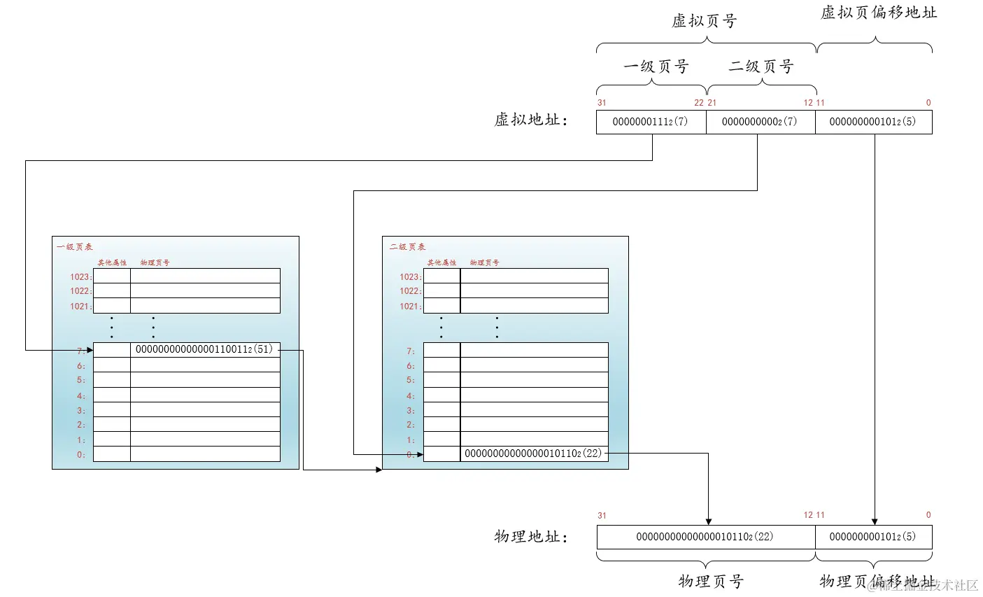 ,所以在二级页表中定位到下标为0的页表项,这个页表项中就包含着最终映射到的物理页页号,本例中最终物理页页号为00000101100000000000₂