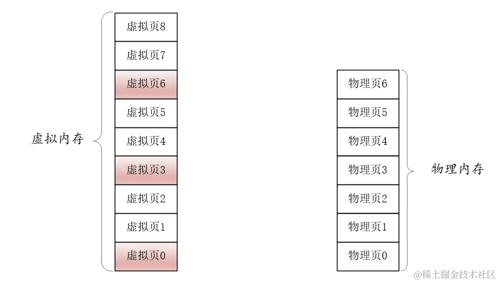 这样我们可以把虚拟内存划分成若干个页,把物理内存也划分成若干个与虚拟内存页大小相同的页,操作系统只需要把虚拟内存页和物理内存页之间的映射关系记录下来就好,而虚拟内存页中的存储单元和物理内存页中的存储单元按照它们在页内的偏移地址自动映射就好了(无需操作系统记录)。