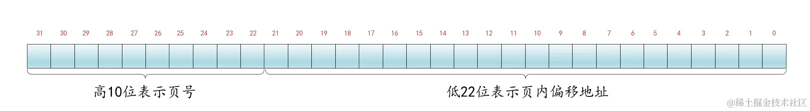 4M = 222次方,也就意味着一个页内的偏移地址由22个二进制位组成,那我们可以将一个32位的虚拟地址分为两个部分:
