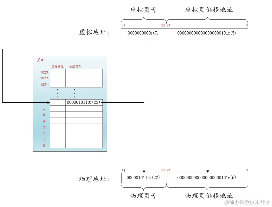 也就是MMU先将虚拟页号作为页表的下标去定位页表项,从页表项的物理页号部分拿出物理页号。虚拟地址的虚拟页偏移地址和物理页偏移地址是相同的,那么将物理页号和其偏移地址拼接起来,就组成了最终的物理地址:00000101100000000000000000000101₂