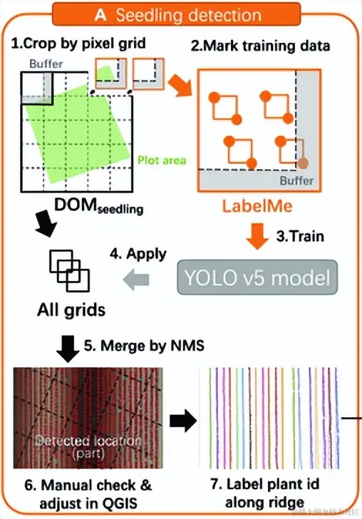 在幼苗阶段,研究人员使用 YOLO v5 进行了西兰花头位置检测,并利用 NMS 算法来合并缓冲区域内的重复检测结果。