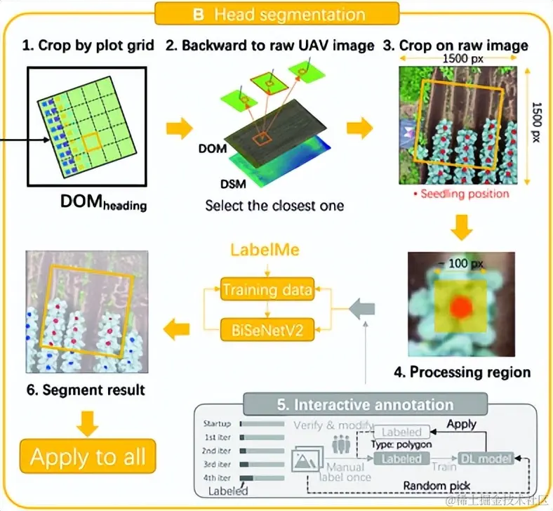 在实验过程中,为减轻深度学习数据标注和处理的工作负担,消除部分土壤和杂草的影响,**研究人员以时间序列数据融合为指导,**缩小了处理区域,仅使用幼苗周围的正方形区域(约 100 × 100 像素,略大于西兰花头)进行西兰花头分割。