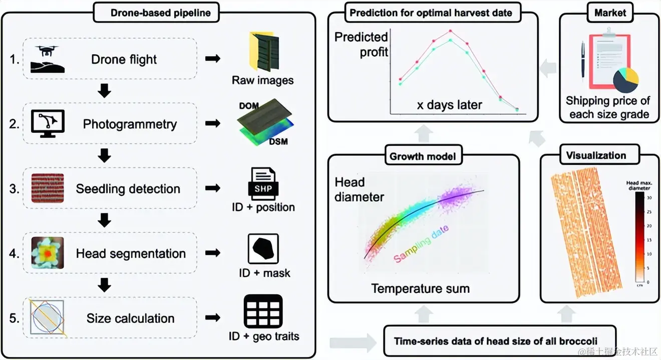 随着无人机飞向田间地头,人们也开始探索基于无人机航拍图像数据,预测最佳采收日期。**来自东京大学和千叶大学的研究人员开发了一套利用无人机采集植物表型数据的系统化流程,**基于无人机遥感和图像分析,预测每个西兰花头的大小,并将数据输入基于温度的生长模型中,从而预测最佳的采收日期。