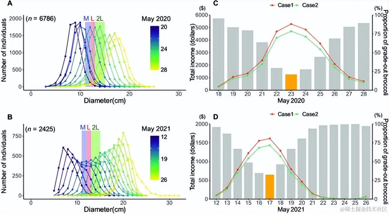在 2020 年的实验中,5 月 23 日是最佳收获日期,即非标准尺寸西兰花比例最小化、总收入最大化的日期。在 2021 年的试验中,5 月 17 日被确定为最佳收获日期。