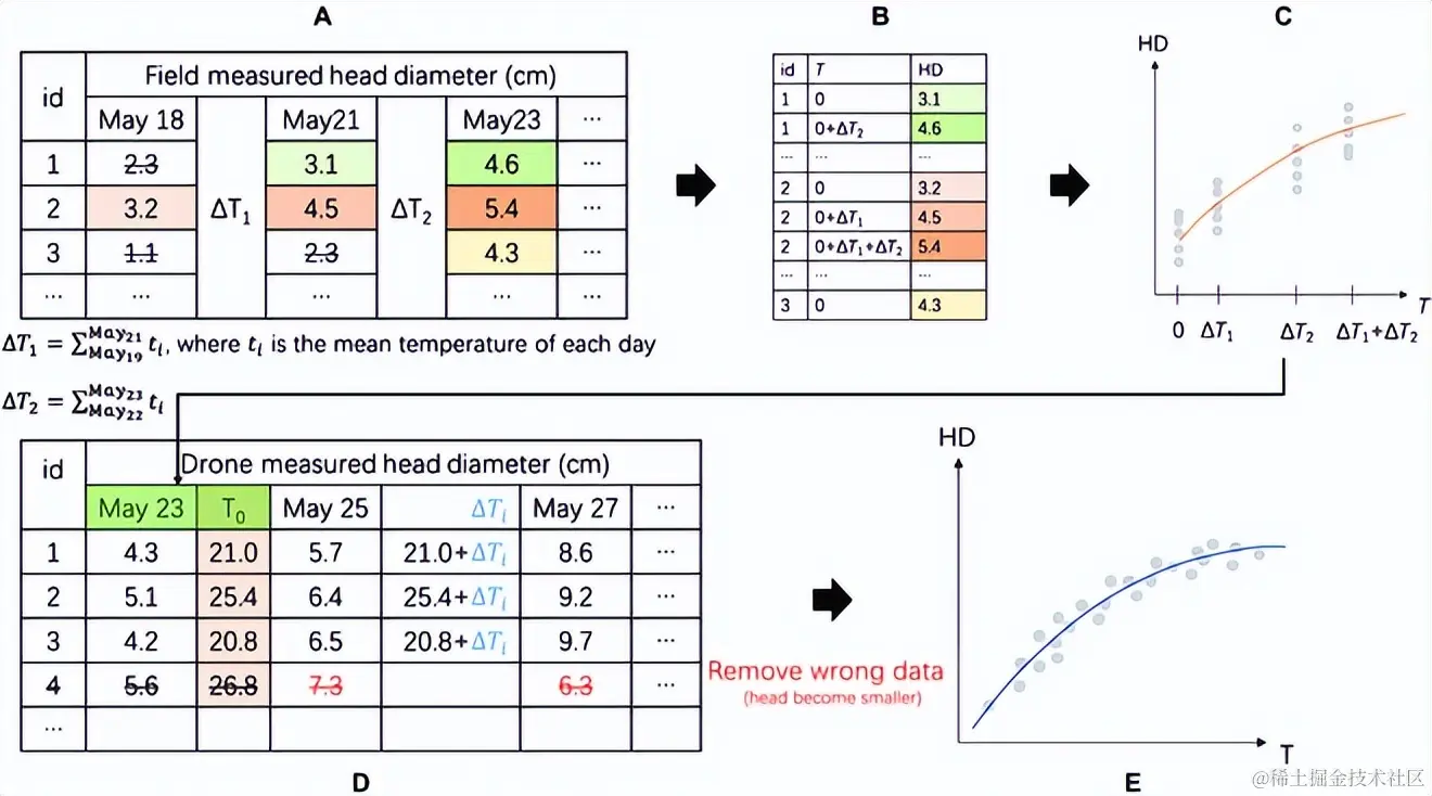 如下图所示,为了获取首次飞行的归一化温度 T(0) (HD 约为9.5厘米),研究人员将先前的模型反转以从 HD 数据中计算 T(0)。然后计算后续天数 (i) 的每日温度和 (Ti),最后对该模型进行回归计算。