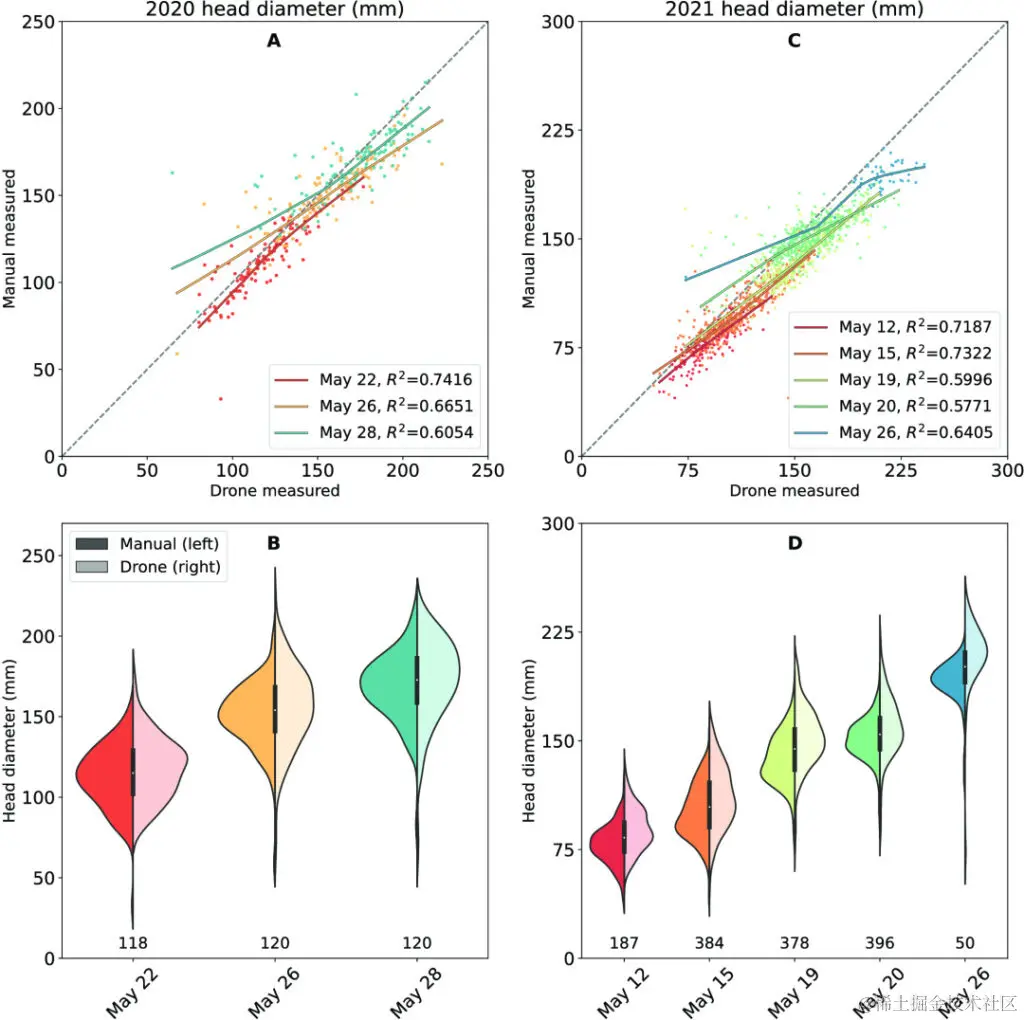 结果表明,二者之间西兰花头部尺寸数据的总体分布几乎相同,决定系数 R²≥0.57。总体而言,基于无人机的测量能够准确地表征整个农田的西兰花高清分布。