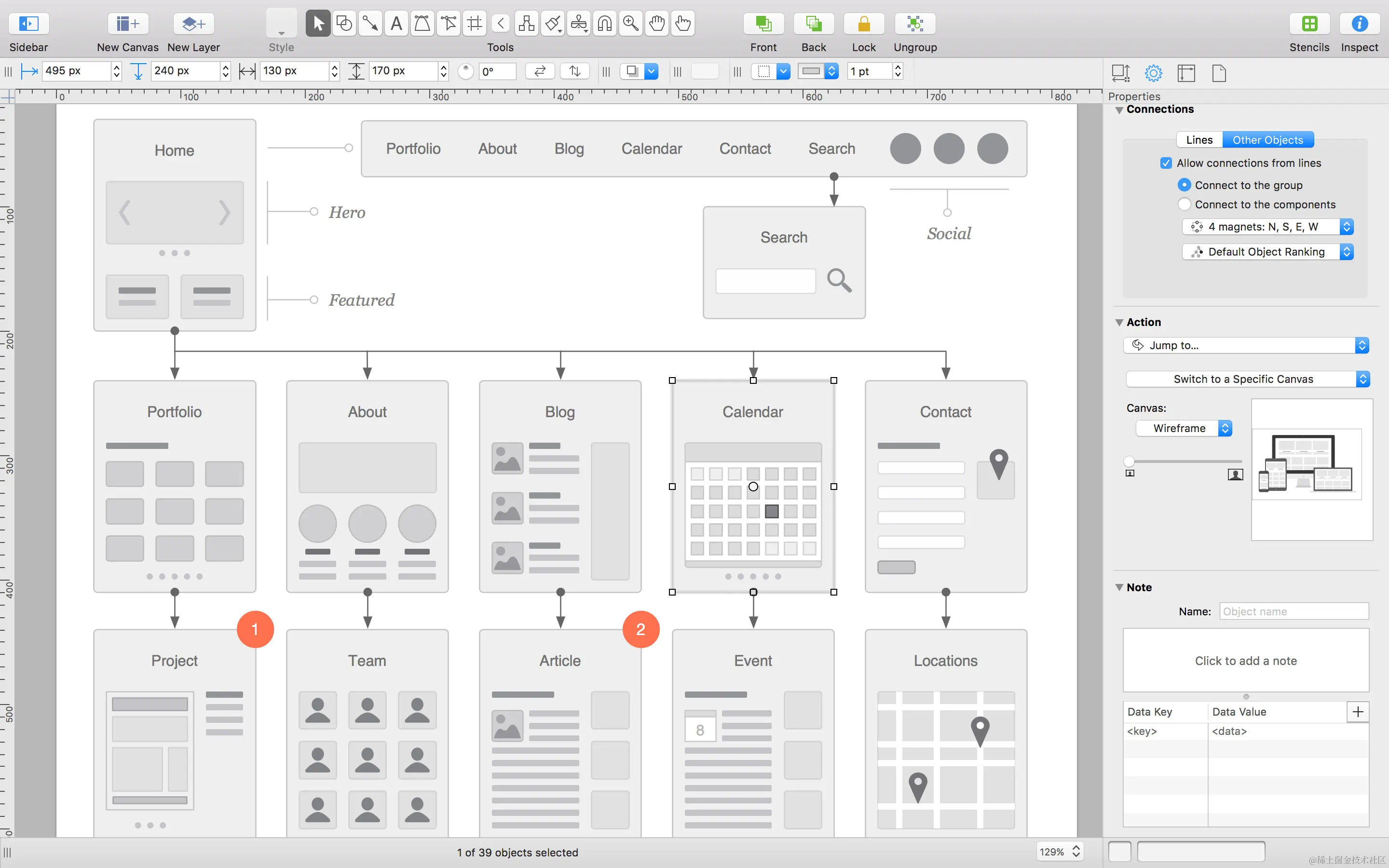 线框图设计:Wireframes是Whimsical的一个主要功能,它可以帮助用户创建和设计网页、移动应用和其他界面的原型。用户可以使用Whimsical的丰富工具和组件库,轻松地绘制和布局界面元素,以及添加交互和动画效果。