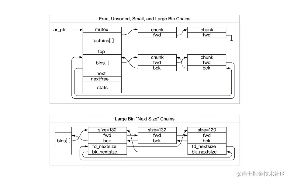 malloc_chunk:chunk是malloc分配的最小单元,每个chunk都有自己的malloc_chunk头结构。 - malloc_state: heaps are governed by a single