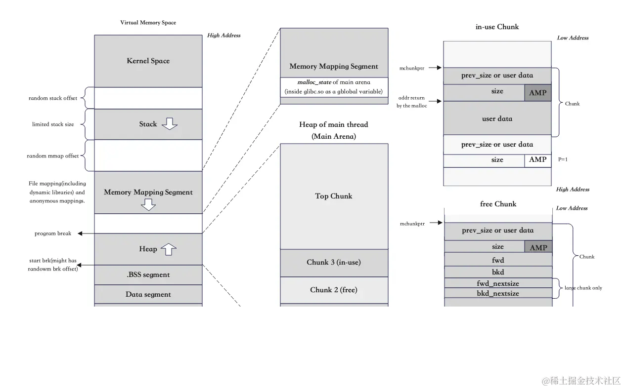 我真的很喜欢上面这句话。我们经常使用的 Heap 这个词指的是进程虚拟内存空间中动态分配的段,但它实际上代表了背后内存池(动态内存分配器)的实现,相当复杂并且可能在不同的机器上有所不同,从而给我们一个利用它的机会。这里我将解释Heap的重要概念,并以Glibc 2.31库中的 ptmalloc 为例。