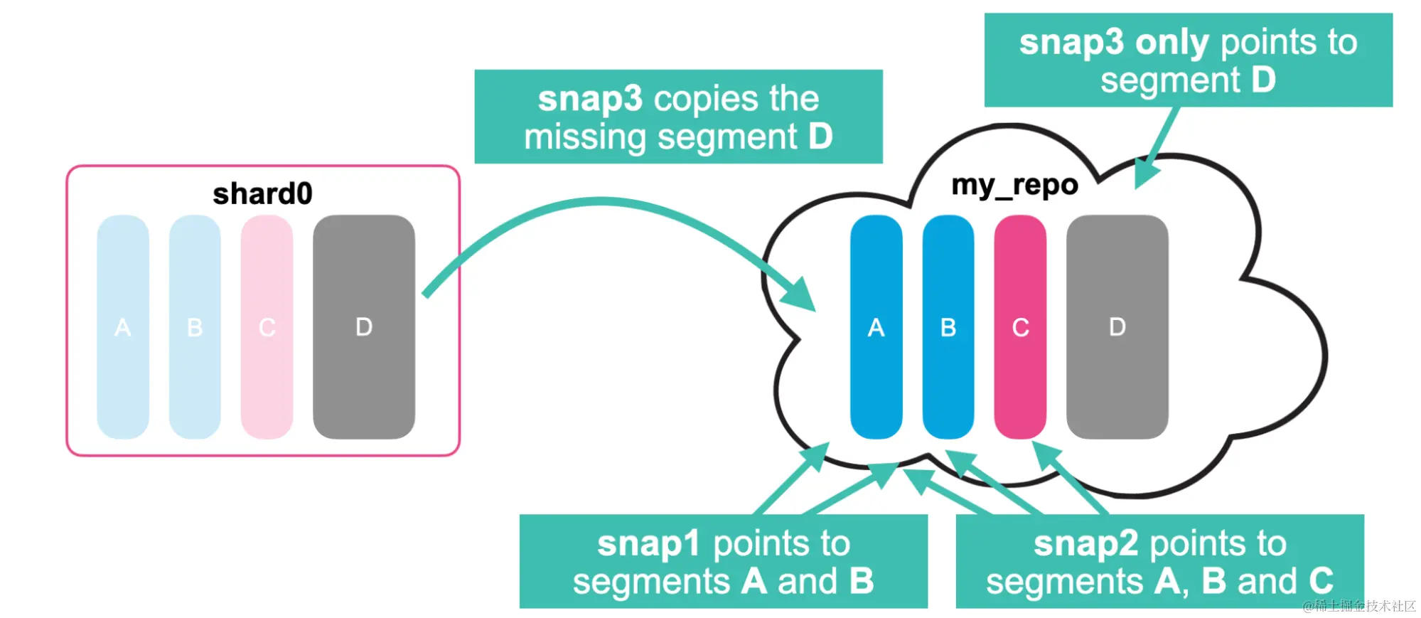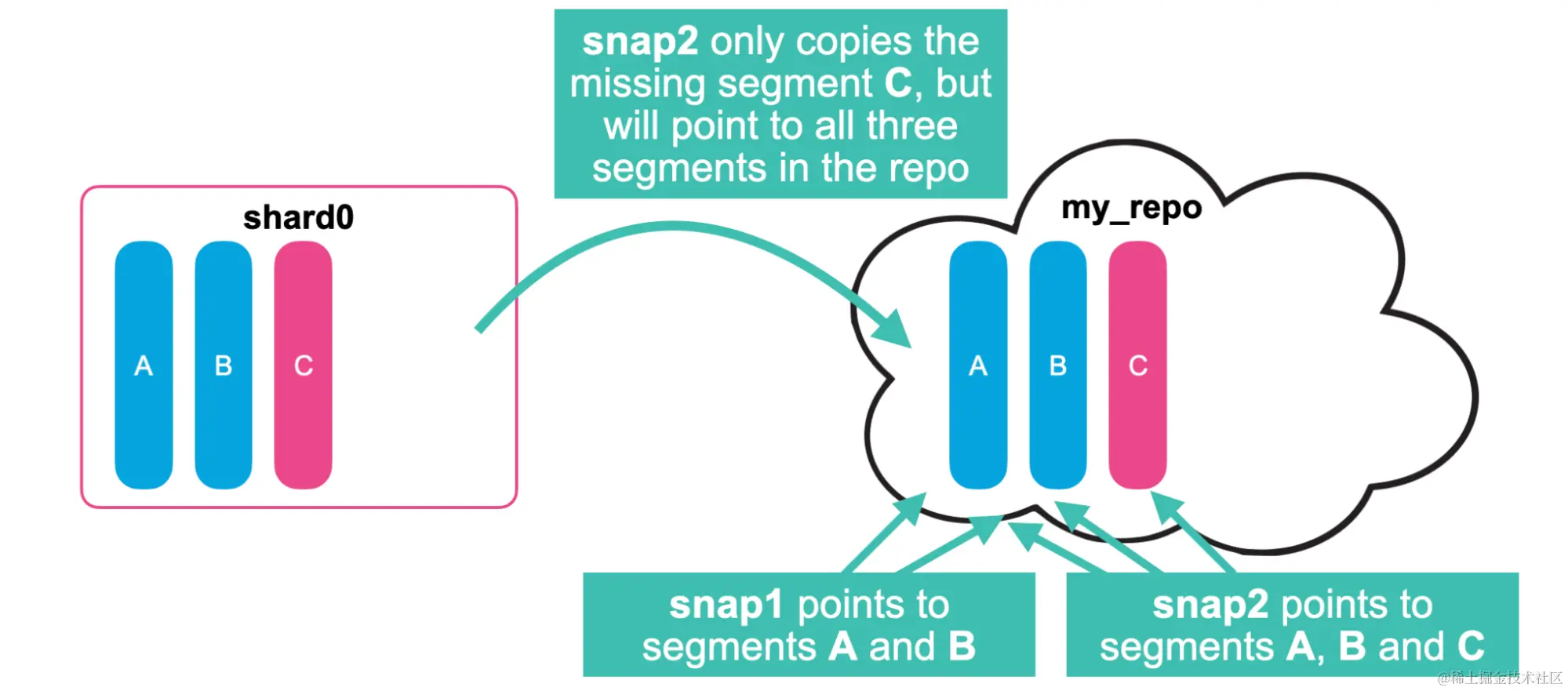 - 第二个快照 (snap2) 只会将缺失的段复制到存储库。