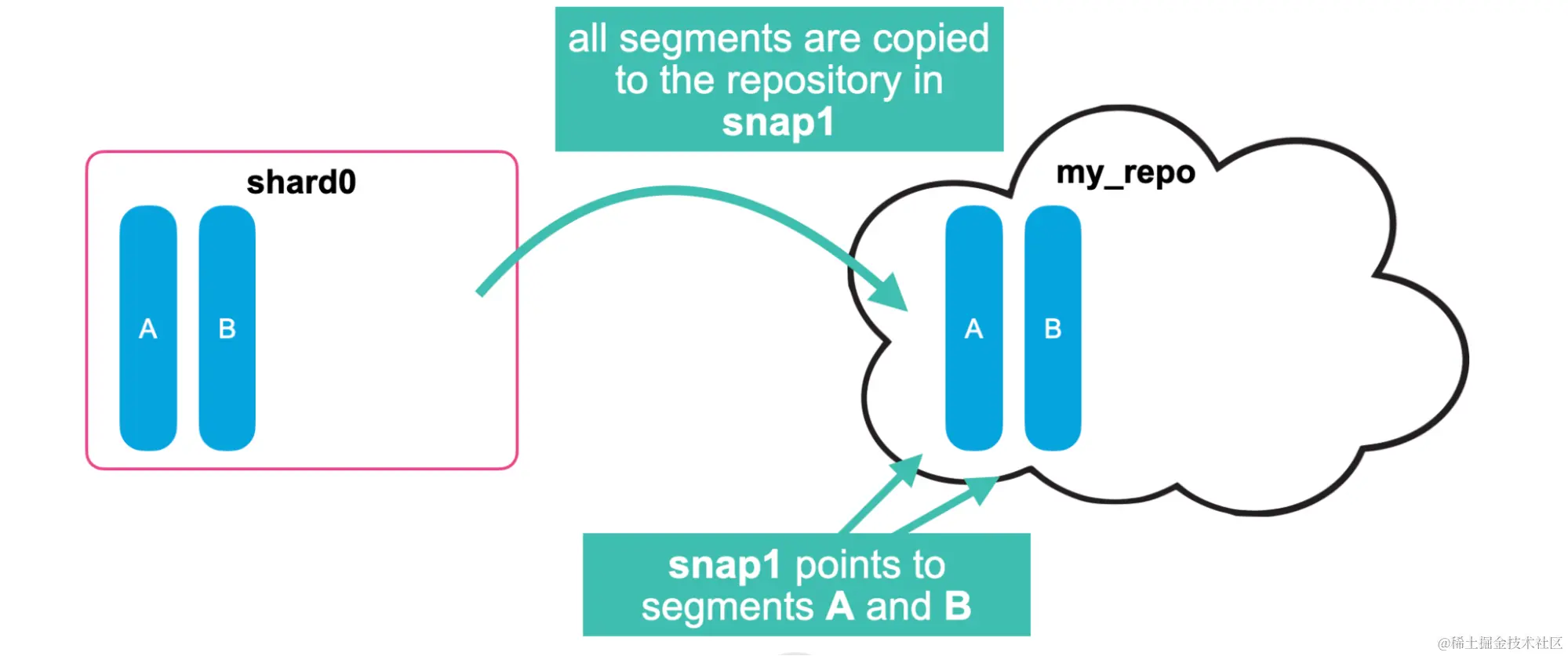 为了备份索引,快照会复制索引的段(segments)并将它们存储在快照存储库中。