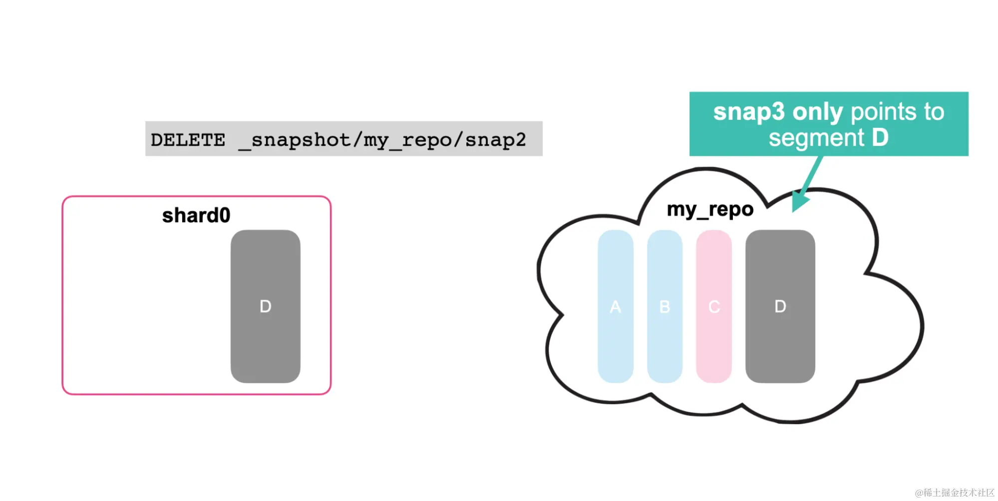 每个快照在逻辑上也是独立的。 当你删除快照时,Elasticsearch 仅删除该快照专用的段。 Elasticsearch 不会删除存储库中其他快照仍在使用的段。