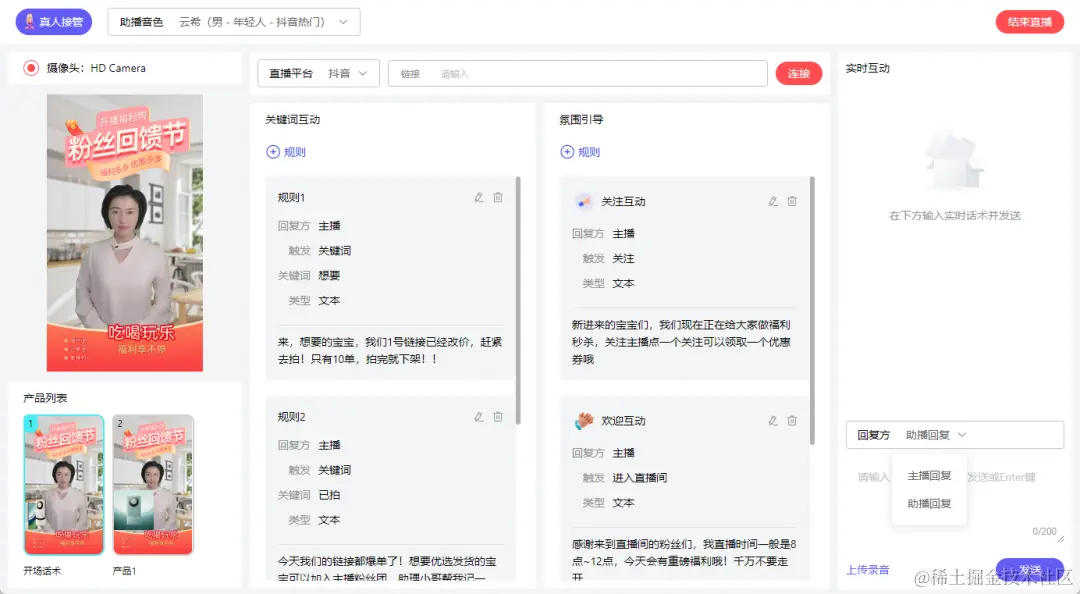用户实时交互,真实感满分:后台设置关键词及回复内容,数字人主播识别关键词,一对一自动回复。直播间氛围引导:新人欢迎、关注感谢、点赞感谢等,支持数字人主播/助播画外音2种互动方式。