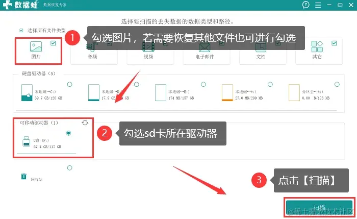 步骤2:如果只需要恢复sd卡中的图片,可以只勾选【图片】,若还需要恢复其他类型文件,也可进行勾选,然后勾选上sd卡所在的磁盘,点击 【扫描】;