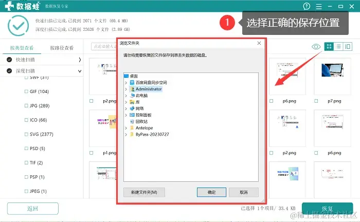 步骤5:找到所有需要恢复的图片后,点击【恢复】 ,并选择电脑上的任意一个磁盘作为文件恢复后的保存磁盘。