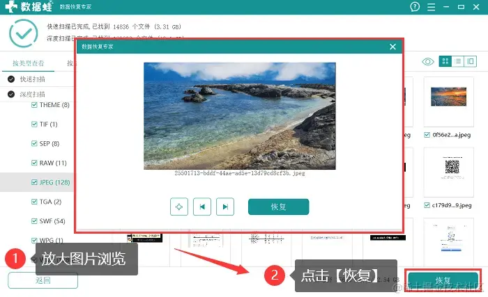 步骤4:深度扫描完成后,用户可以查看到所有被扫描到的图片,如果不确定是否是需要恢复的图片,可以放大来进行确认;