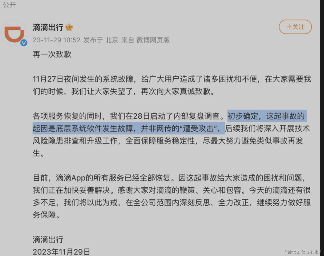 2023年11月27日晚至2023年11月28日早晨,滴滴发生了长达12小时的P0级故障,导致滴滴核心业务都受到了影响,比如不显示定位无法打车、滴滴单车无法扫码等问题,期间滴滴进行了多次致歉