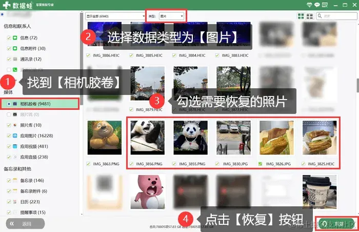 步骤3:待扫描彻底结束后,在左侧目录中找到【相机胶卷】并进行单击预览,勾选后点击右下角的【恢复】按钮即可。