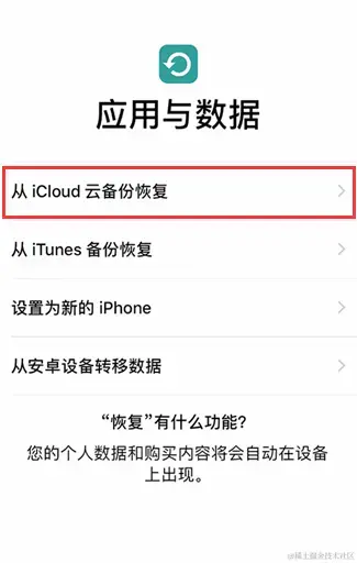 步骤3:激活后,在【应用与数据】页面,选择【从iCloud云备份恢复】进行数据还原即可找回丢失的照片。