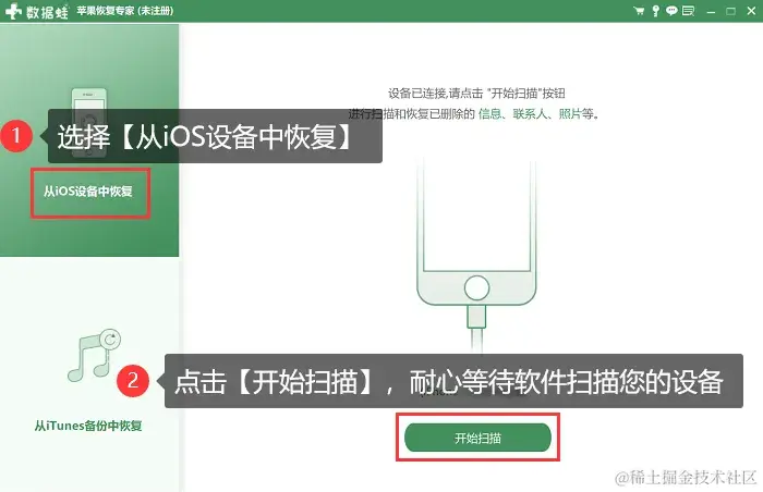步骤2:无备份用户请选择【从iOS设备中恢复】模式,然后单击【开始扫描】进入数据扫描页面,在扫描的时候要耐心等待。