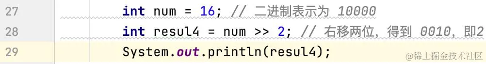 “>>”是右移位运算符,用于将一个数的二进制表示向右移动指定的位数。右移一位相当于除以2,右移两位相当于除以4,以此类推。举个例子: