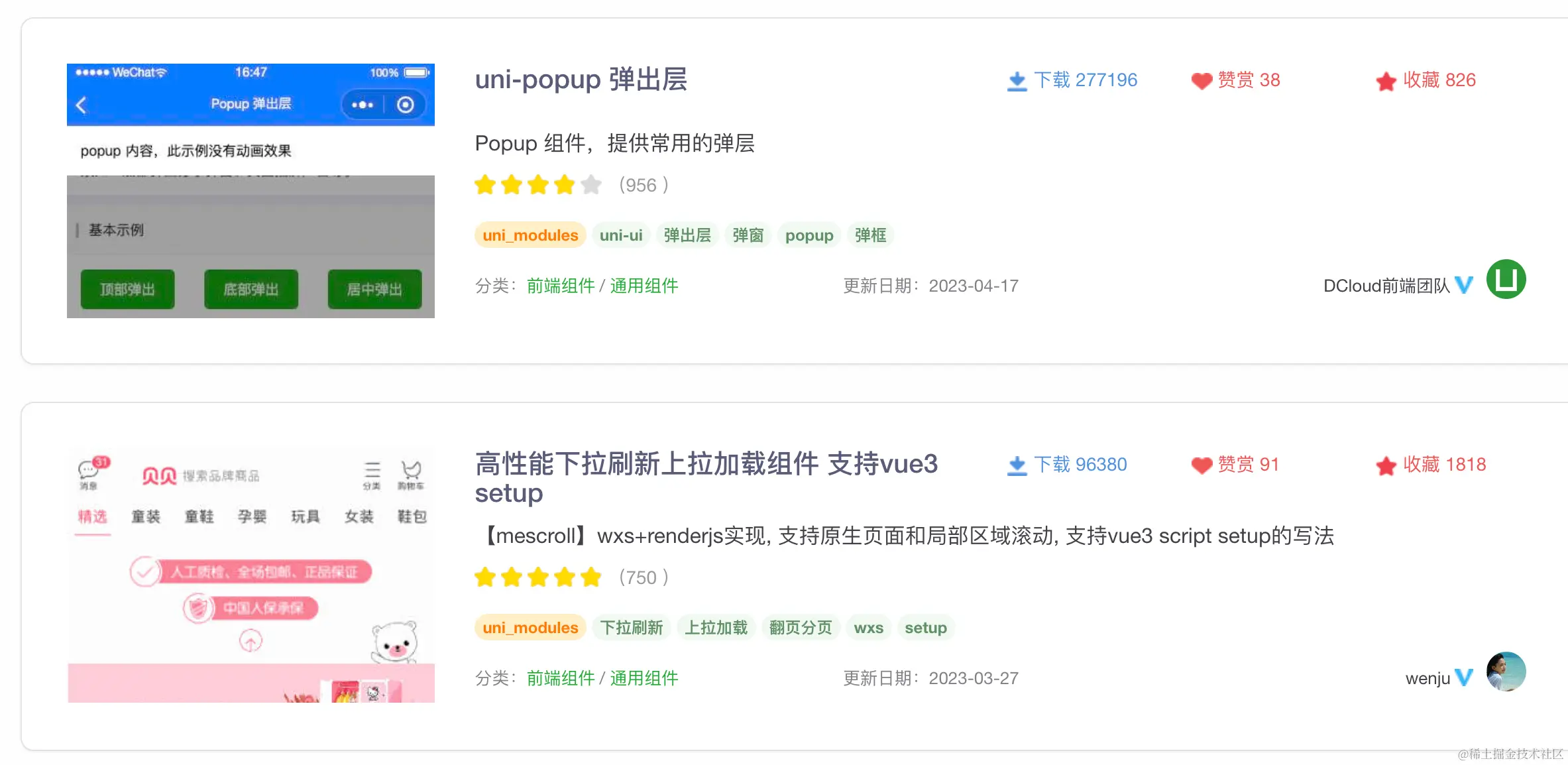 其次,我们可以利用插件来扩展项目的功能。uniapp 提供了许多插件,可以帮助我们快速集成一些常用的功能,避免重复开发。但同时也要谨慎选择插件,确保其质量和稳定性。在这方面,咋可以根据自己的需求,去uniapp市场去按关键词搜索,按排名和评价量,一般靠前的都基本满足了需求,而且也有一定的稳定性,如下: