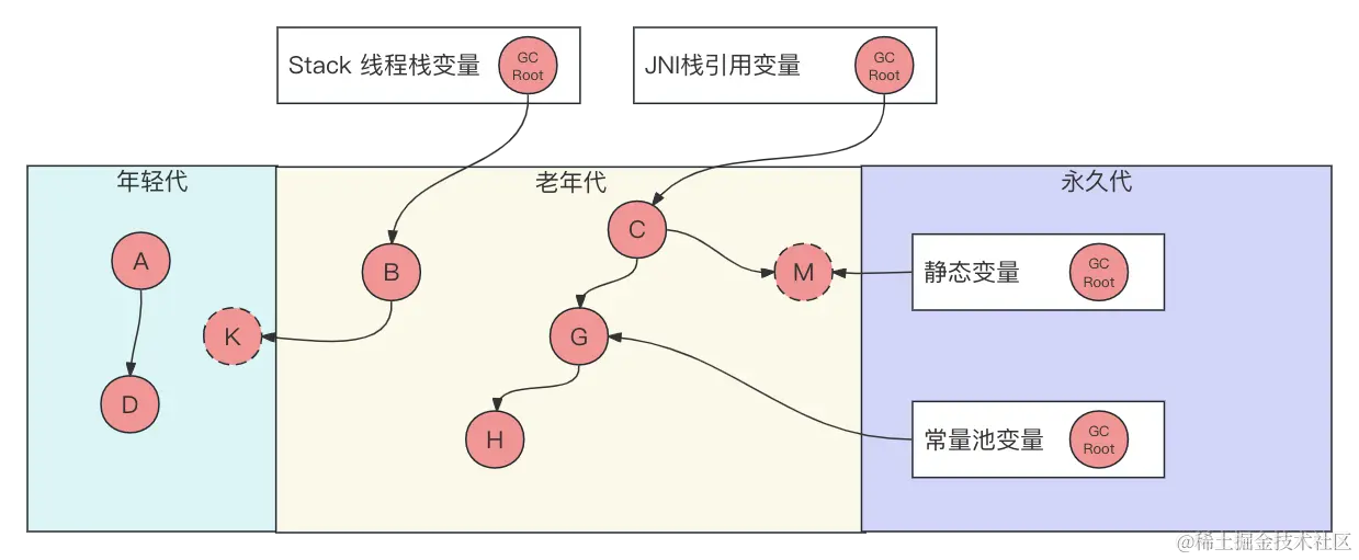 | 静态变量 (Static Variables) | 类的静态成员变量引用的对象。静态变量随着类的加载而初始化,它们的引用可能使对象保持存活。 |