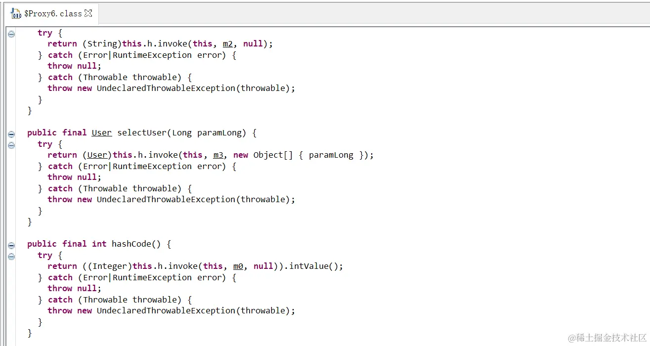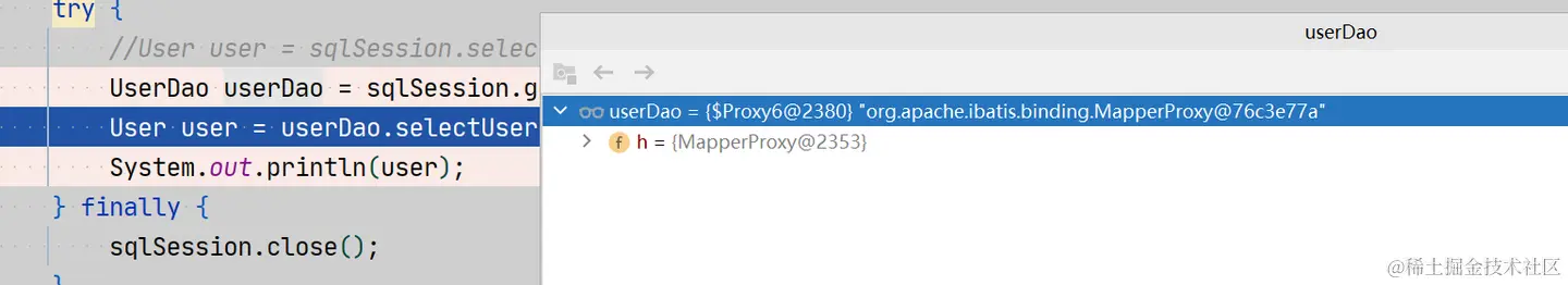 这是生成的代理类,实现了UserDao接口,并实现了selectUser方法,具体selectUser方式是怎么处理,这里就不深入了,主要是在MapperProxy的invoke中来处理。