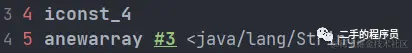 anewarray 后面跟了一个类名 String。表示需要创建String类型的数组,数组的大小由前一条指令给出,也就是4。