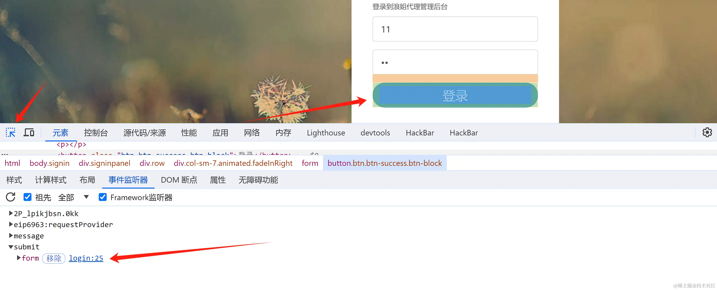 当我们不确定某处的js文件位置时,可以使用F12,点击元素审查,然后点击登录处,观察事件监听器
