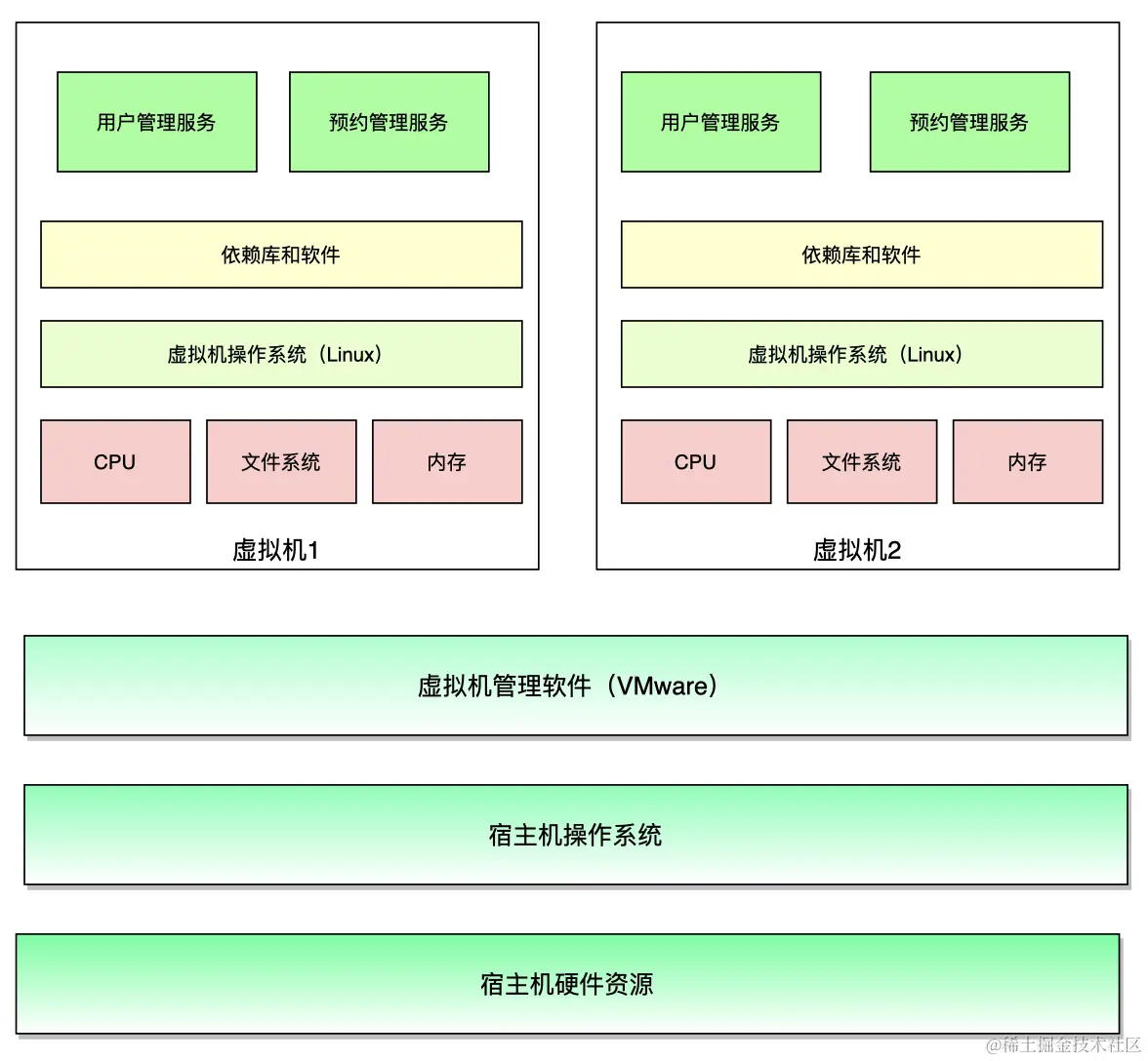 - 不同应用程序依赖于同一类库的不同版本,必须使用不同的机器