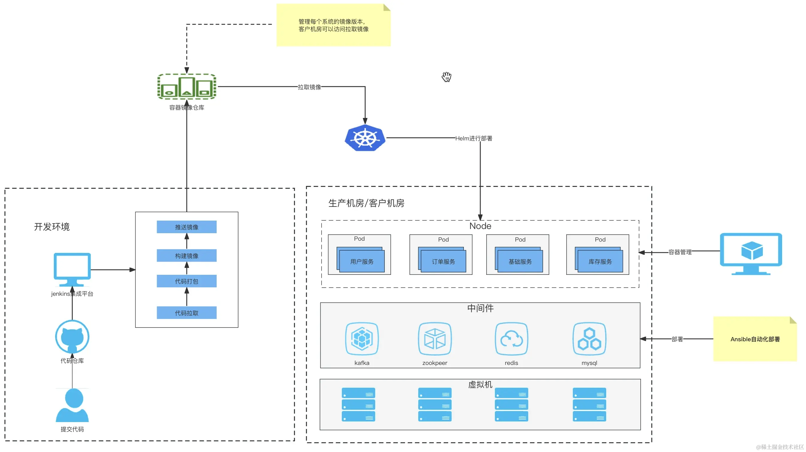 采用k8s进行容器管理,在发布服务时,构建基础容器镜像,到镜像仓库,在对应环境访问镜像仓库,拉取对应容器镜像进行部署