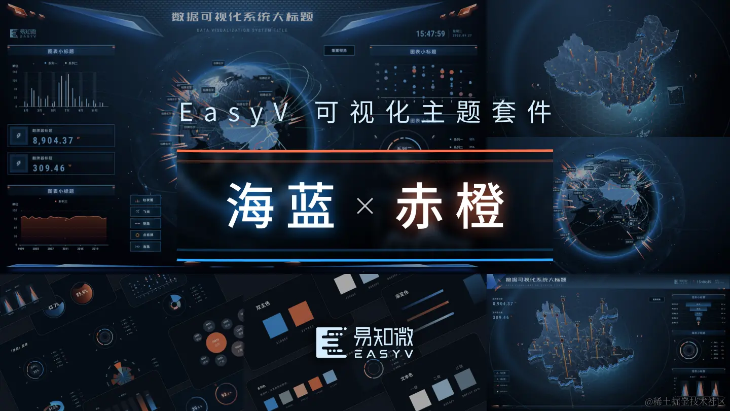 因此,易知微推出了「幻醒蓝」主题套件,幻醒蓝带着神秘而迷人的意韵,融合了天空的清澈和海洋的深邃,能赋予科技大屏一股蓬勃的生命力量。