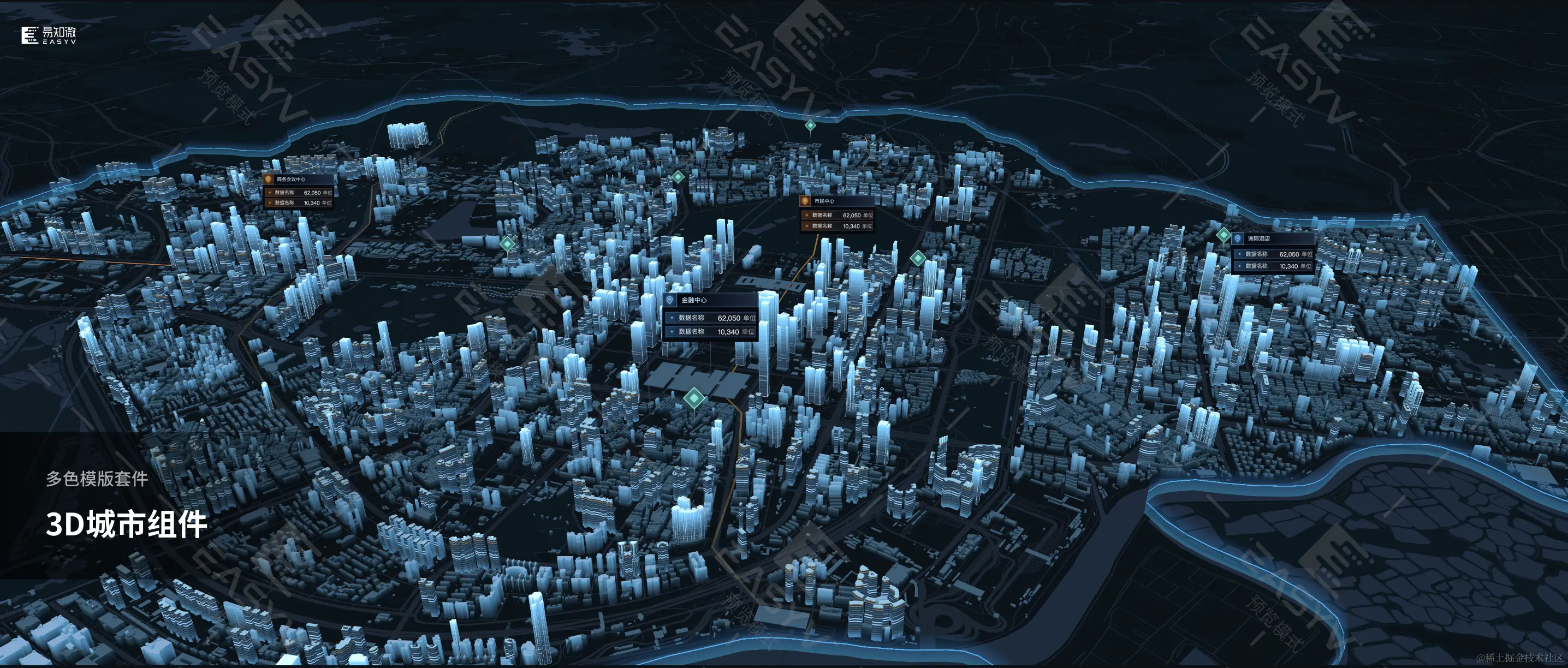 易知微EasyV数字孪生可视化平台以低代码的方式,提供数据源实时接入、拖拽式数字面板呈现、三维模型及地理信息孪生场景构建等可视化应用的协同搭建能力。平台内置200+官方自研的可视化标准组件和超过1000+的行业应用模板供用户直接使用,只需通过简单的拖拉拽即可完成复杂交互、视觉震撼、实时数据的可视化应用搭建,能够以更低的成本、更高的效率满足客户指挥中心、数字展厅、数字化管理等各类应用场景的建设需求。