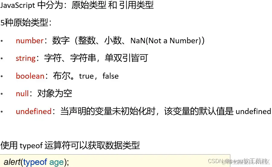 var关键字: 1. 作用域很大 相当于全局变量 原始类型类似java的基本类型, 引用类型都是对象