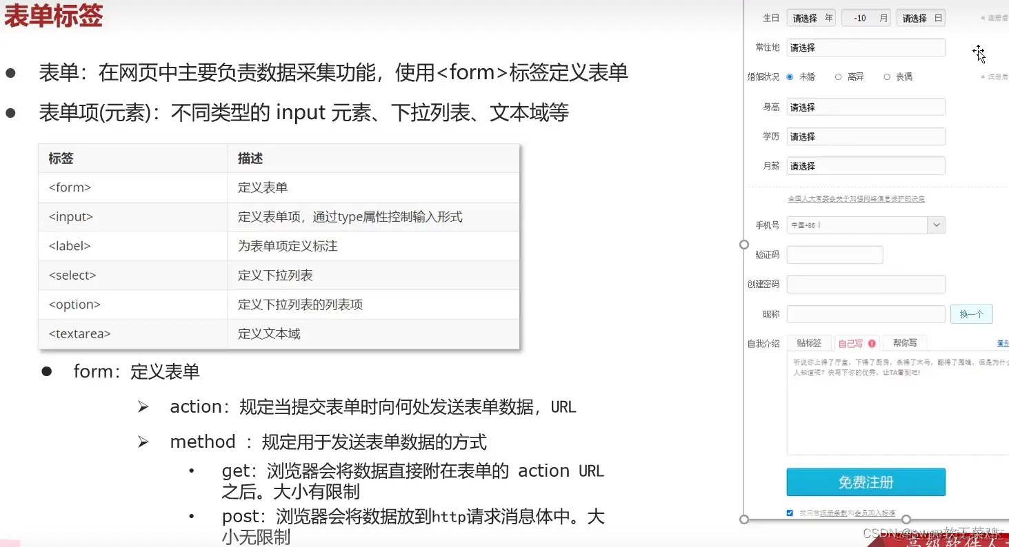 action:指定表单数据提交的URL * 表单项数据要想被提交,则必须指定其name属性 method:指定表单提交的方式 1. get:默认值 * 请求参数会拼接在 URL地址局域栏 后边 * url的长度有限制 4KB 2. post: * 请求参数会在 http请求协议的请求体 中 * 请求参数大小无限制