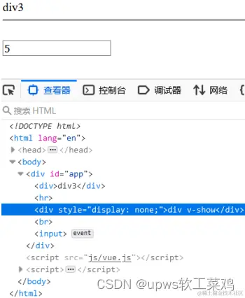 可以看出 v-show 不展示的原理是给对应的标签添加 display css属性**,