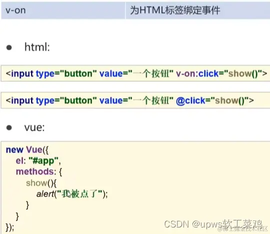 注意: v**-on: 后面的事件名称是之前原生事件属性名去掉****on 。