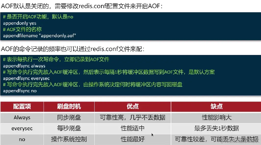AOF的含义是追加文件,当redis操作写命令的时候,都会存储这个文件中,当redis实例宕机恢复数据的时候,会从这个文件中再次执行一遍命令来恢复数据