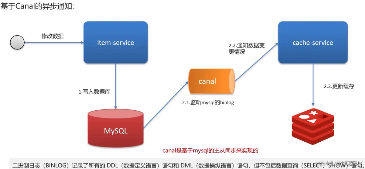 我们当时采用的阿里的canal组件实现数据同步:不需要更改业务代码,部署一个canal服务。canal服务把自己伪装成mysql的一个从节点,当mysql数据更新以后,canal会读取binlog数据,然后在通过canal的客户端获取到数据,更新缓存即可。