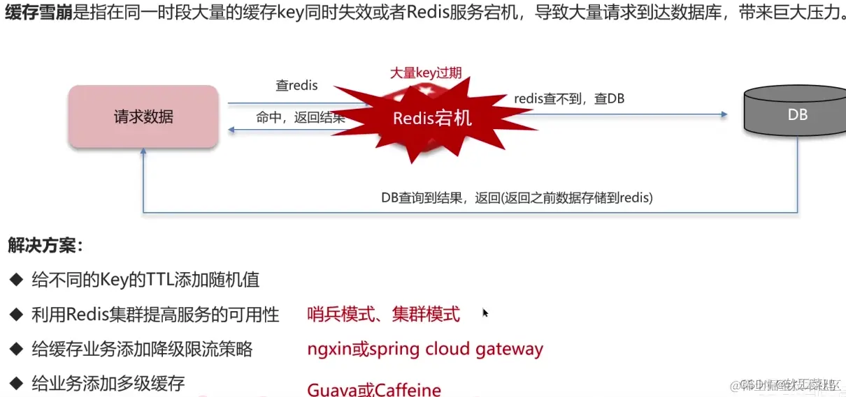 缓存雪崩意思是设置缓存时采用了相同的过期时间,导致缓存在某一时刻同时失效,请求全部转发到DB,DB 瞬时压力过重雪崩。与缓存击穿的区别:雪崩是很多key,击穿是某一个key缓存。