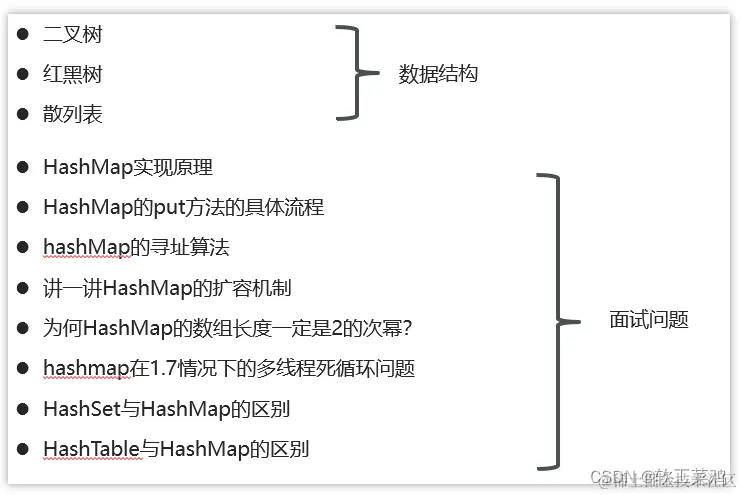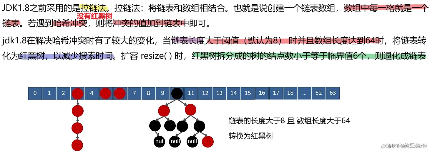 JDK1.8之后采用数组+链表+红黑树,链表长度大于8且数组长度大于64则会从链表转化为红黑树