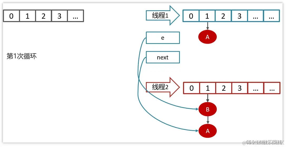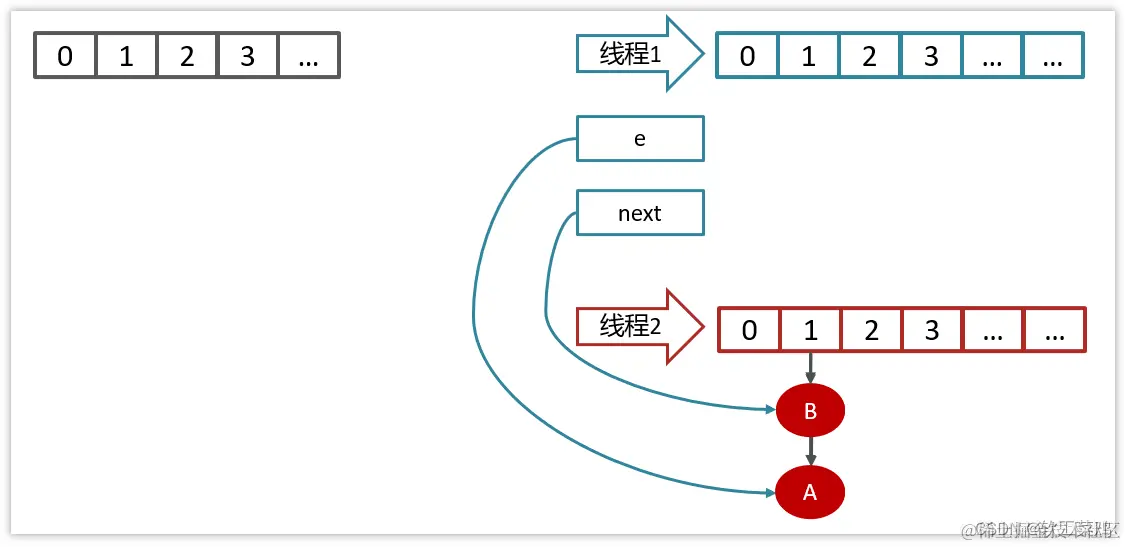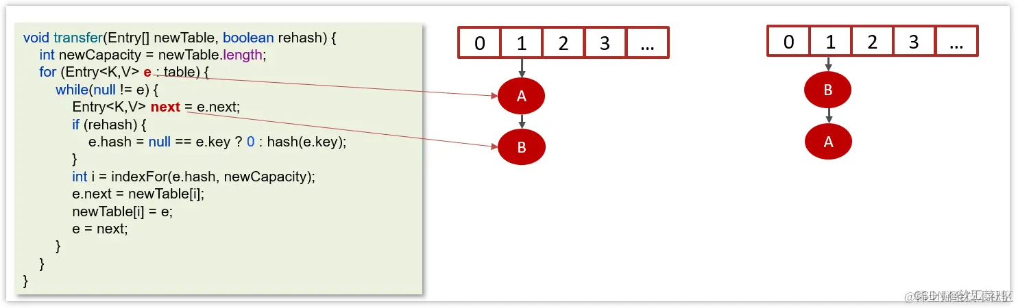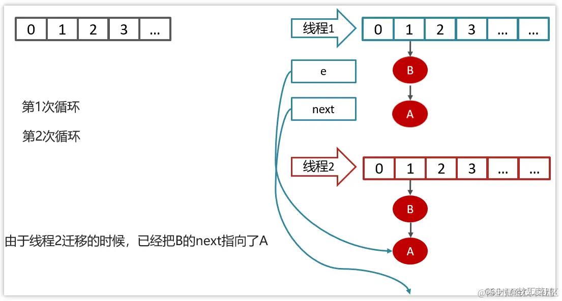 线程一先将A移入新的链表,再将B插入到链头,由于另外一个线程的原因,B的next指向了A,所以B->A->B,形成循环。