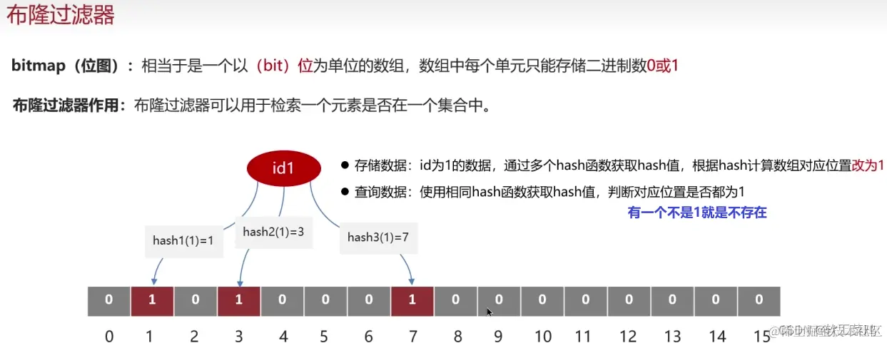 它的底层主要是先去初始化一个比较大数组,里面存放的二进制0或1。在一开始都是0,当一个key来了之后经过3次hash计算,模于数组长度找到数据的下标然后把数组中原来的0改为1,这样的话,三个数组的位置就能标明一个key的存在。查找的过程也是一样的。