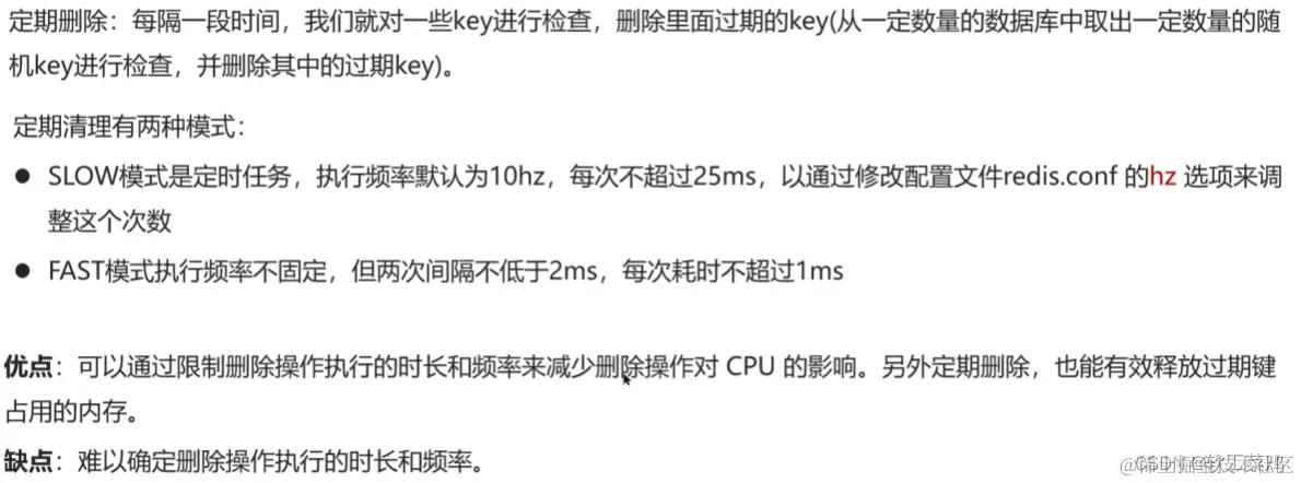 - SLOW模式是定时任务,执行频率默认为10hz,每次不超过25ms,以通过修改配置文件redis.conf 的 hz 选项来调整这个次数