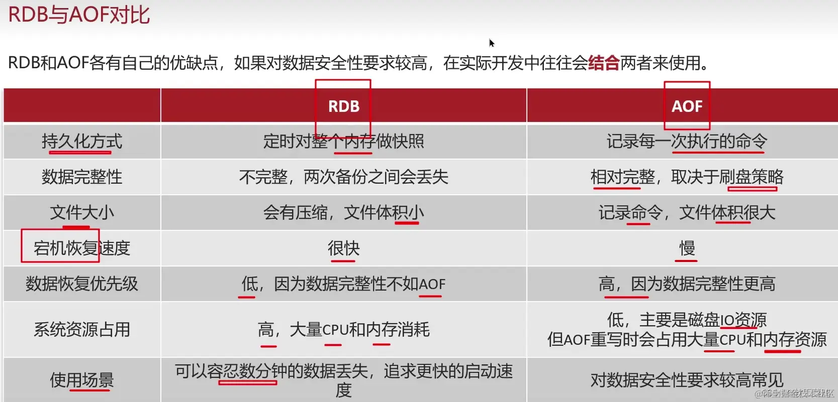 候选人:RDB因为是二进制文件,在保存的时候体积也是比较小的,它恢复的比较快,但是它有可能会丢数据,我们通常在项目中也会使用AOF来恢复数据,虽然AOF恢复的速度慢一些,但是它丢数据的风险要小很多,在AOF文件中可以设置刷盘策略,我们当时设置的就是每秒批量写入一次命令