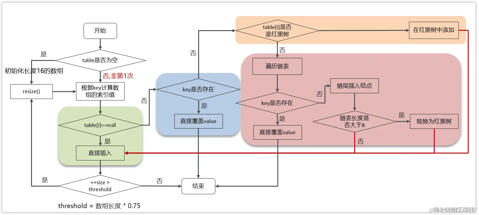 在添加元素或初始化的时候需要调用resize方法进行扩容,第一次添加数据初始化数组长度为16,以后每次每次扩容都是达到了扩容阈值(数组长度 * 0.75)