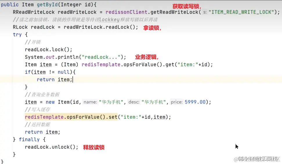 我们采用的是redisson实现的读写锁,在读的时候添加共享锁,可以保证读读不互斥,读写互斥。当我们更新数据的时候,添加排他锁,它是读写,读读都互斥,这样就能保证在写数据的同时是不会让其他线程读数据的,避免了脏数据。这里面需要注意的是读方法和写方法上需要使用同一把锁( 从redission里拿一样的 ) 才行。