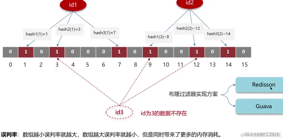 当然是有缺点的,布隆过滤器有可能会产生一定的误判,我们一般可以设置这个误判率,大概不会超过5%,其实这个误判是必然存在的,要不就得增加数组的长度,其实已经算是很划分了,5%以内的误判率一般的项目也能接受,不至于高并发下压倒数据库。